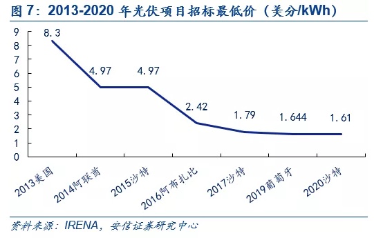 根据我们测算,当光伏电站系统投资成本降至3.71元/W以下,三类资源区在平价后项目运营内部收益率(IRR)仍可以达到8%,而目前光伏电站系统投资成本已经降至3.5-3.8元/W,光伏行业已经具备平价条件,8%的类公用事业项目收益率在当前资产荒的时代背景下显得更加珍贵,未来随着初始投资成本降低带动LCOE下降,光伏发电的经济性也将愈发凸显。