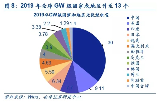 度电成本大幅下降,越来越多的国家和地区成为GW级市场。受到技术进步、规模化经济、供应链竞争日益激烈和开发商经验日益增长的推动,根据IRENA (International Renewable Energy Agency)的统计,在过去十年间(2010-2019)太阳能光伏发电成本下降了82%,成本的下降主要是由于电池板价格和系统配套费用的降低,其中前者降幅达90%,根据Inter Soalr的统计2019年光伏度电成本已经下降至4美分/kWh。成本大幅下滑叠加能源转型诉求,2017、2018年全球GW级市场(国家或地区)分别为9个和11个,2019年上升至13个,越来越多国家和地区的光伏需求大幅提升。
