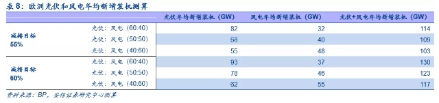 欧洲夯实能源转型政策,提升可再生能源占比目标。2020年9月17日,欧盟发布将2030年可再生能源占比目标从32%以上提升至38%-40%;由于在减排目标的倒逼下,未来欧洲碳减排减排目标或提升至60%,因此未来欧洲可再生能源发电占比将持续提升至约42%-44%的水平。根据预计发电量增量,在现有的风电和光伏装机的基础上,若在减排目标55%的基础上,预计2020-2030年光伏和风电合计年均新增装机量在103-114GW的范围内,若在减排目标60%的基础上,预计合计年均新增装机量 117-130GW的范围内。