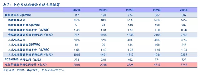到2025年,电力系统用储能行业市场规模将达到5,000亿以上。其中,2021-2025年市场空间分别为2,016、2,946、3,824、4,617和5,748亿元,2021-2025年均增速有望达到46.28%。其中,磷酸铁锂型储能2021-2025年市场空间分别为767、1,195、1,648、2,105和2,765亿元,年均增速约65.13%;三元型储能2021-2025年市场空间分别为1,015、1,401、1,713、1,941和2,257亿元,年均增速约30.59%;储能逆变器和EMS市场空间分别为234、349、463、571和726亿元,年均增速约52.56%。