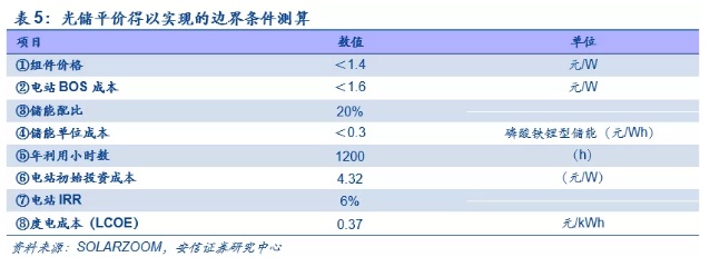 光储平价势在必行,降本之路仍需努力。根据SOLARZOOM的测算,目前光伏电站配套储能度电成本约为0.6元/kWh(其中光伏发电度电成本0.3kWh、储能度电成本0.3kWh)。由于缺乏盈利模式,因此目前为了有效解决消纳问题,光储平价势在必行。根据我们测算,在电站年利用小时数为1200、配套20%储能以及电站项目收益率为6%的前提下,组件价格、电站BOS成本、储能单位成本分别降至1.4元/W、1.6元/W以及0.3元/kWh以下时,电站的LCOE可以下降至0.37元/kWh,从而实现光储平价。这需要光伏产业链持续降本增效、储能成本大幅下降以及电站端降低项目收益率预期三者的共同努力。