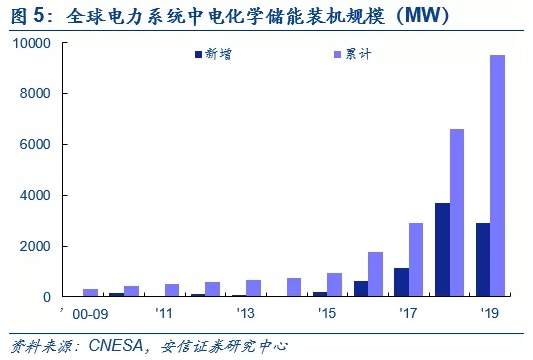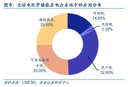 从全球已投运电化学储能项目在电力系统中的应用分布看,根据CNESA的统计,截至 2018 年,用户侧领域的累计装机规模最大,为2.2GW,占比32.6%;辅助服务、集中式可再生能源并网、电网侧和电源侧分列二至五位。从2018年全球新增投运项目的应用分布看,同样是用户侧领域的新增装机规模最大,为1.6GW,占比43.8%;集中式可再生能源并网、辅助服务、电网侧和电源侧分列二至五位,所占比重分别为25.2%、15.8%、13.8%和1.3%。