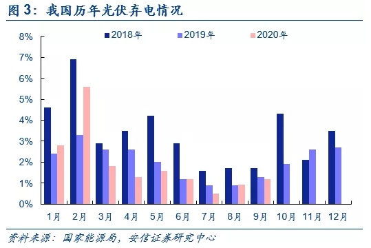 平价时代消纳问题成为硬约束。我国太阳能和风能资源丰富程度在空间上呈现为由西北向东南递减,而主要负荷则集中在东南沿海地区。电力负荷无法满足太阳能和风能出力会出现弃光和弃风问题,此外新能源渗透率过高会造成电网运行的不稳定,也是制约光伏和风电装机增长的一大因素。由于2018年“531”暂停新增装机以及特高压线路接连投运,2019年国内弃光率下降至为2%,相比2018年的3%下降1pct,已经有了大幅改善,目前弃光严重的地区主要是西北的西藏、新疆和青海。