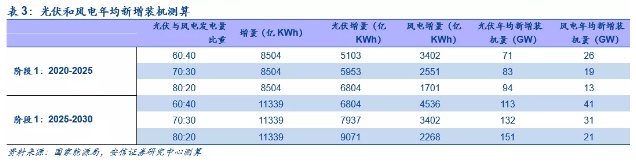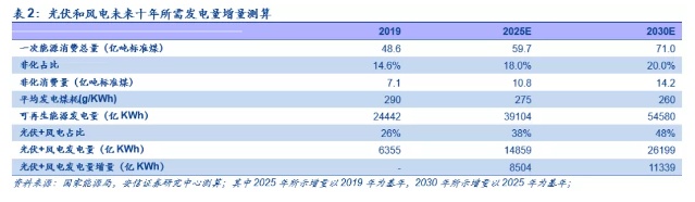 我们假设非化石能源占比在未来十年持续提升,于2025年和2030年分别提升至18%和20%,在平均发电煤耗逐年下降,光伏+风电发电量占比逐年提升的基础上,我们分别以2019年和2025年为基年,预计2025年和2030年所需光伏+风电发电量增量分别达0.85万亿KWh和1.13万亿KWh。