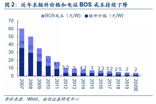 行业持续降本增效,光伏发电经济性愈发凸显。近年来光伏行业降本增效仍在持续推进,从未间断。一方面,产业链自上而下在泛摩尔定律的作用下,不断实现技术迭代和工艺优化,实现了生产成本的大幅下降,与此同时补贴退坡也倒逼全产业链压缩利润空间。2020年6月组件价格触及1.45元/W的历史低点,7月份以来由于硅料和辅材价格上涨,组件价格有所回升,但随着2021年硅片环节释放超额利润,中期硅料、辅材供需平衡后价格回落,未来组件价格仍有进一步下降的空间;另一方面,由于电池转换效率提升以及大尺寸组件等技术应用,电站BOS成本也呈现逐步下降态势。