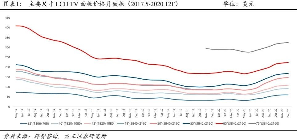 受下半年需求转好,以及韩厂减产供给受限带动,今年自6月TV面板价格转涨以来,下半年面板报价持续超预期。根据群智咨询最新发布的11月下旬价格预测数据,我们统计预计截至2020年12月,55寸以下LCD TV面板价格相比5月低点平均涨幅达70%。创造了同等时间,价格区间涨幅的历史新高。65/75寸由于国产10.5/11代产能爬坡供给带动,价格涨幅不如55寸以下产品,但对应价格涨幅也分别达34%与17%,预计目前也均在产线盈利水平以上。