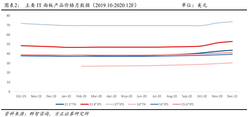 受益于海外市场旺盛需求,IT面板(显示器、笔电)下游市场自20Q2以来持续保持较高的景气度。产品价格整体自20Q1以来持续上涨。进入到20Q4,海外市场因卫生事件需求依然强劲,供应端手机、TV需求旺盛,造成a-Si产能持续紧张,叠加驱动IC、CPU、偏光片等核心材料缺货,面板厂价格策略积极,涨价金额有进一步扩大趋势。根据群智咨询最新的11月价格预测数据,根据我们的统计,预计截至2020年12月,主要尺寸IT面板报价相比年初1月平均涨幅达9.7%。