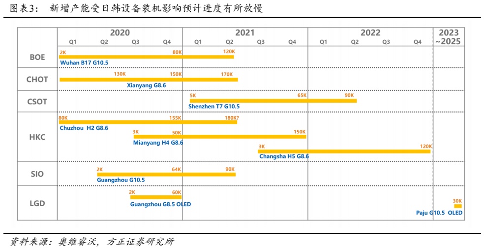 但目前来看,2020年以来受海外卫生事件持续影响,日韩设备装机进度,以及工程师人员往来均受不同程度影响。包括10.5代线玻璃基板短缺,对富士康夏普广州产线进度亦有影响。固原有厂商新增产能计划,完成进度亦有不确定性。预计2021新量产产线TCL华星T7、惠科长沙G8.6,满产时点亦将延至2022年。