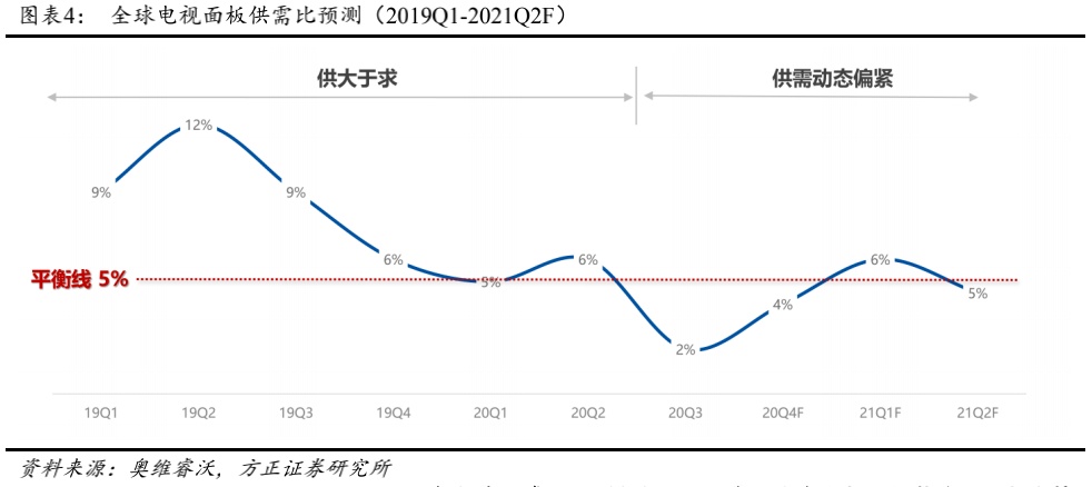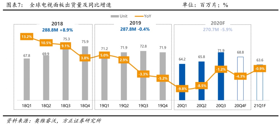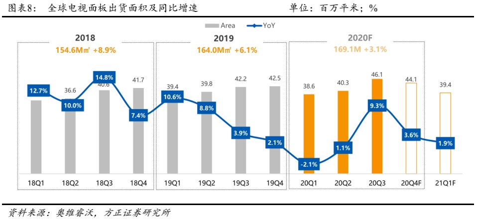 具体来看,根据奥维睿沃数据,20Q1与20Q2电视整机出货量分别同比下降8.7%与3.7%,20Q3出货同比增长13.2%,预计20Q4整机销售量仍将同比增长0.7%。