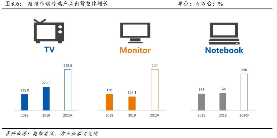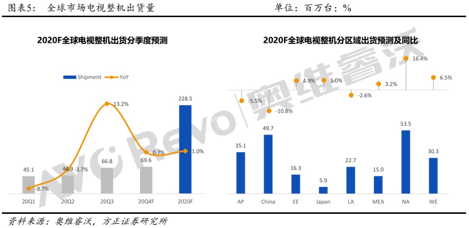 根据奥维睿沃预测数据,预计2020年TV整机出货同比增长1.0%,显示器与笔电产品出货分别同比增长7.8%与15.9%。按年度维度来看,TV整机全年呈现出“前低后高”走势,但整体出货量也仅仅恢复至卫生事件前正常水平。考虑到未来,今年出货同比下滑地区的出货修正,按年度维度来看,我们认为TV产品需求仍有望维持稳定。
