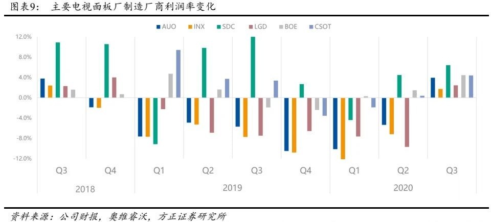 随着20Q3电视面板价格的大幅回暖,全球主要电视面板厂商的整体经营利润率亦持续转好。LG显示更是经历了连续6个季度的经营性亏损后,首次季度盈利转正。三星显示由于减少了LCD的产能供应,叠加小尺寸OLED产品的持续拉货,20Q2起面板经营性利润率率先转好。