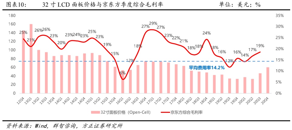 从32寸LCD面板售价,与京东方的综合毛利率走势来看,随着行业整体价格的转暖,京东方的综合毛利率也持续提升。我们认为龙头厂商的高盈利有望持续。