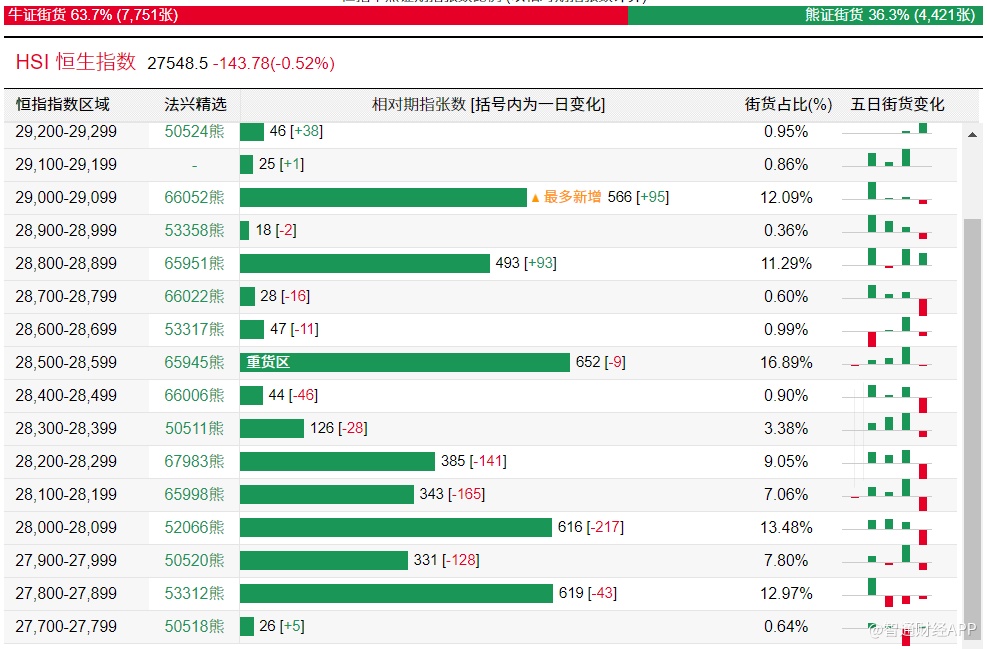 法兴恒指牛熊证街货分布图中的数据显示,熊证街货重货区在28500-28599区间,该区间最新熊证数量为652张,较上一交易日减少9张;最多新增在29000-29099区间,该区间最新熊证数量为566张,较上一交易日增加95张。牛证街货重货区在26500-26599区间,该区间最新牛证数量为512张,较上一交易日增加118张。最多新增在27200-27299区间,该区间最新牛证数量为351张,较上一交易日增加163张。