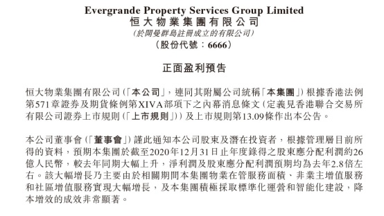 1月7日,恒大物业(06666)发布上市后首份盈喜公告,预计2020年净利润及股东应分配利润大幅上升至26亿,均为去年同期的2.8倍左右。