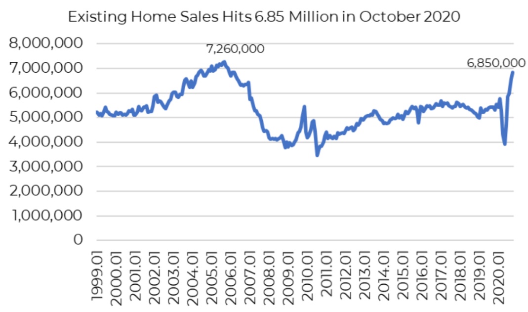 2020年,受公共卫生事件的影响,美国房地产市场在今年春季经历短期低迷后出现爆发式复苏。据全美房地产经纪人协会(NAR)报告显示,2020年10月,美国现房销售达到685万套,创1999年1月以来第二高历史水平,今年春季所损失的销量已完全修复。