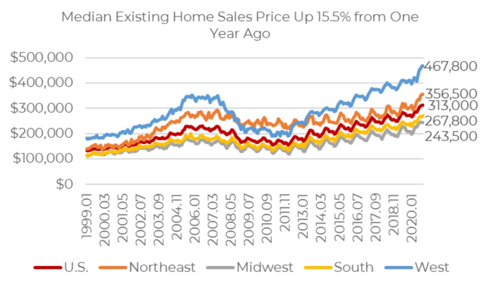 其中,全美所有地区现房销售额涨幅超过20%:东北部(30.4%)、中西部(28.1%)、南部(26.5%)和西部(22.8%),中西部和南部的销售额创历史新高。在美国房地产火热的市场行情下,月末库存供应量也降至2.5个月,创1999年1月以来新低。