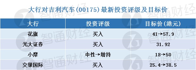 一、大行对吉利汽车(00175)最新投资评级及目标价
