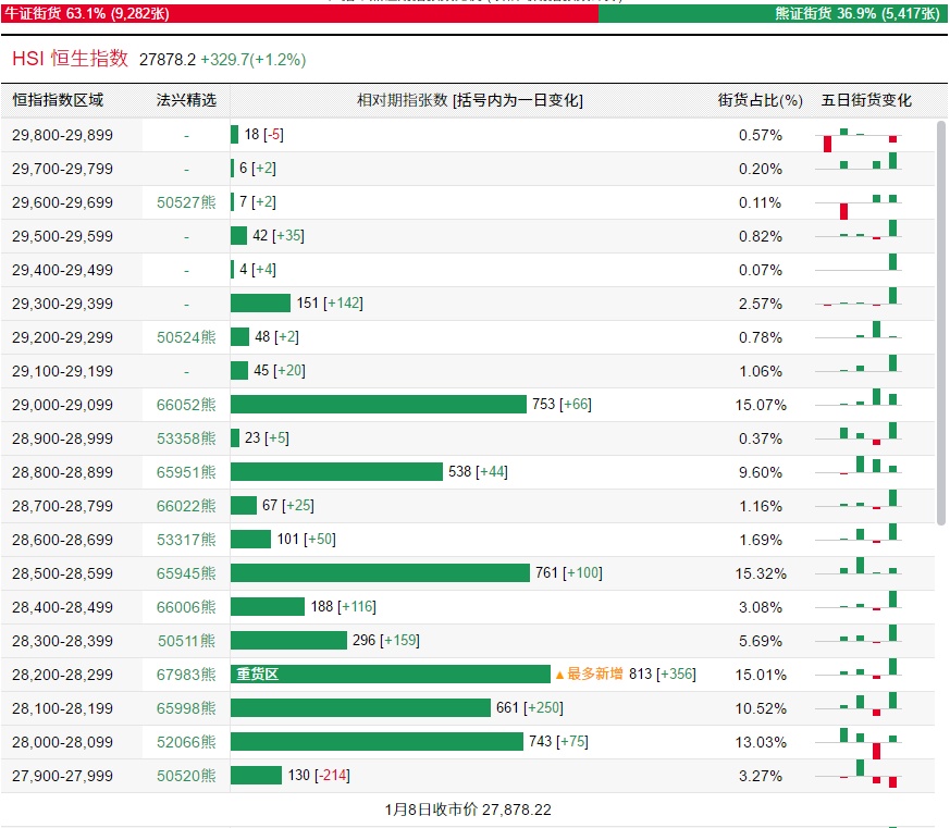 智通财经APP获悉,截至1月8日,恒指最新的牛熊街货比例为63:37。