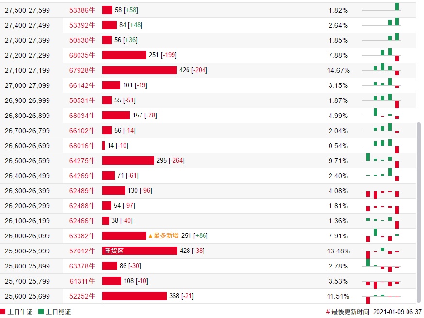 法兴恒指牛熊证街货分布图中的数据显示,熊证街货重货区在28200-28299区间,该区间最新熊证数量为813张,较上一交易日增加356张,最多新增也在该区间。牛证街货重货区在25900-25999区间,该区间最新牛证数量为428张,较上一交易日减少38张。最多新增在26000-26099区间,该区间最新牛证数量为251张,较上一交易日增加86张。