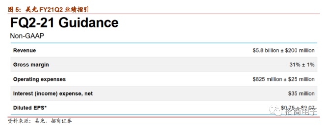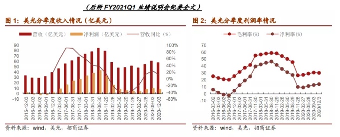 美光科技公司是高级半导体解决方案的全球领先供应商之一,主要制造并销售DRAM、NAND闪存以及存储器模块等产品,公司总部位于美国特拉华州。FY21Q1,公司营收约58亿美元,环比-5%,同比+12%,远超出此前业绩指引上限(50-54亿美元),调整后营收环比+3%;净利润8亿美元,同比+64%;毛利率30.9%,EPS $0.78,均超出预期。公司业务指标超出此前公司及市场预期,主要原因系电动汽车、图形、客户端、移动和消费者等广泛下游市场强劲增长导致DRAM和NAND的需求和价格均好于预期。