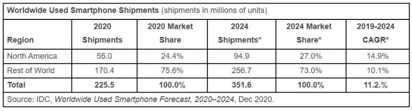 智通财经APP获悉,根据市场研究机构 IDC 最新数据显示,2020年全球二手智能手机出货量(包括官方翻新和二手售卖手机)预计将达2.254亿部,同比增长9.2%,此外,IDC预计,2024年二手智能手机出货量将达3.516亿部(市值650亿美元),2019年至2024年的复合年增长率达11.2%。