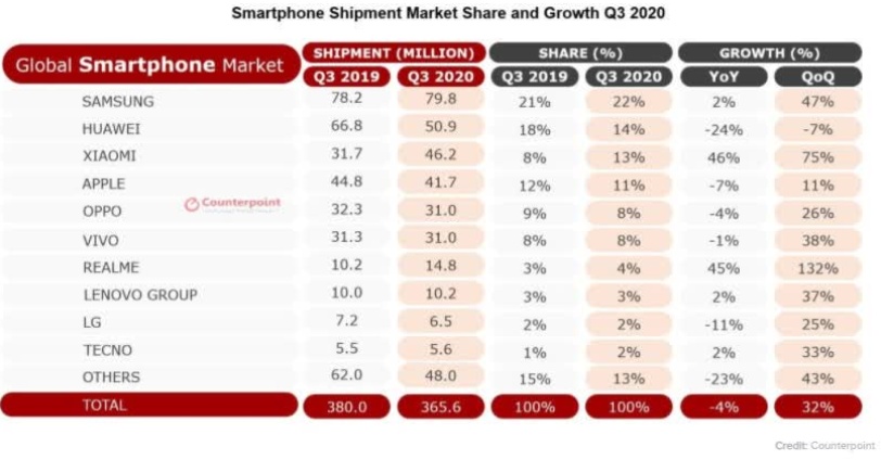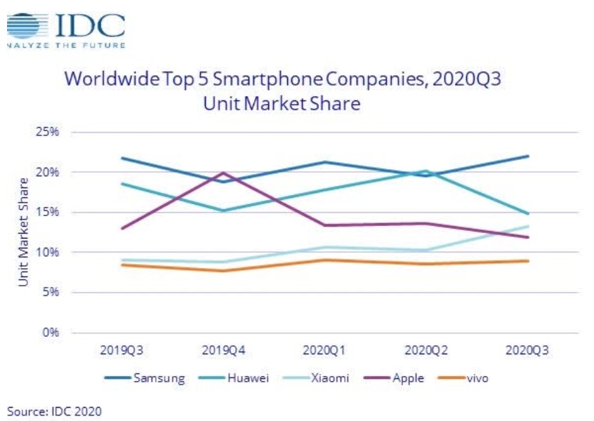 据悉,早前IDC公布了2020年第三季度全球智能手机出货量数据,其中三星(22.7%的市场份额)重新第一;小米(01810)以创纪录的季度业绩并获得13.1%的全球市场份额,超越苹果(AAPL.US)成为全球第三大智能手机制造商。
