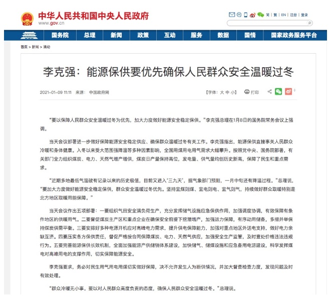 国务院总理最新强调——要以保障人民群众安全温暖过冬为优先,加大力度做好能源安全稳定保供。