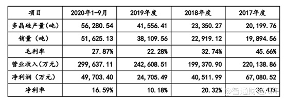 2020年11月,大全新能源在科创板回复函也中间接公布三季度报告。报告显示,2020年前三季度,公司共实现营业收入29.96亿元,同比提高85.2%,前三季度实现净利润4.97亿元,同比增长497.5%。