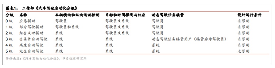 《汽车驾驶自动化分级》根据在执行动态驾驶任务中的角色分配以及有无设计运行条件限制,将驾驶自动化分为0~5共6个等级,其中L3,称之为有条件自动驾驶,是辅助驾驶和自动驾驶的分水岭,其定义为系统在其设计运行条件内能够持续地执行全部动态驾驶任务。L3以下称之为辅助驾驶,L3以上称之为自动驾驶。