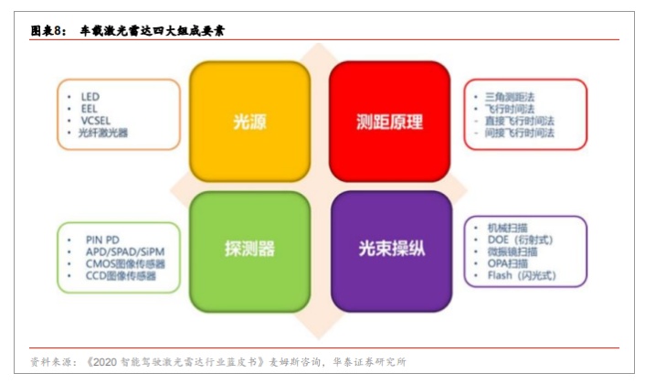 总结来看,一个激光雷达包括四大要素:分别为测距原理、光束操纵方法、光源以及探测器。在此基础上,不同技术路线是以上相关元素的组合。