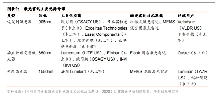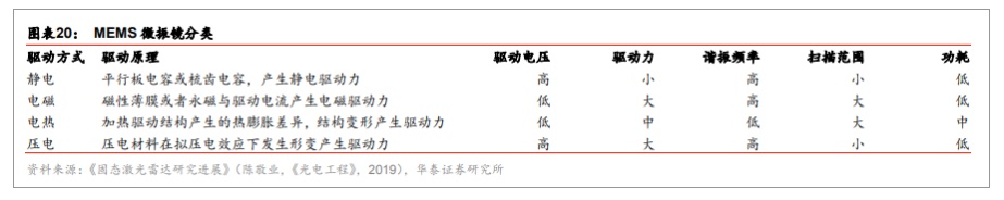 相比于机械式激光雷达,混合固态激光雷达在体积、成本端皆有优势,但由于MEMS微振镜技术门槛较高,供应量相对不成熟,且MEMS微振镜对于振动敏感,需要研究隔离振动技术。目前可提供混合固态激光雷达的公司包括:Innoviz、Luminar(LAZR.US)、Velodyne、速腾聚创、禾赛科技等。