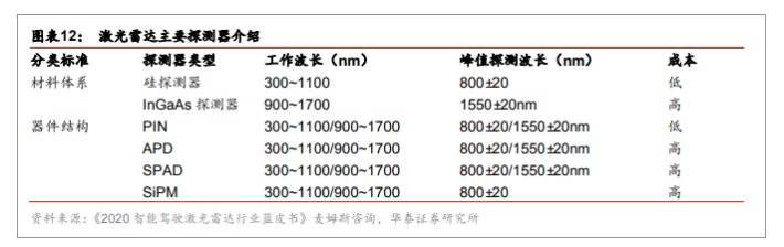 探测器方面。激光雷达的探测器按照材料分类主要包括硅探测器以及InGaAs探测器,按照器件结构可以分为PIN探测器、APD探测器、SPAD探测器以及SiPM探测器等。