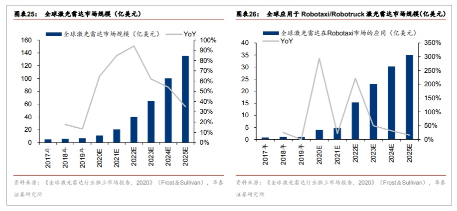 细分市场方面,在Robotaxi/Robotruck领域,随着其商业化的开启,拥有高精度测绘能力的激光雷达有望迎来快速上量期,沙利文预计在2025年全球市场规模有望达到35亿美元,2020~2025年复合增速为80.89%。对于L4级别以上的无人驾驶系统,激光雷达被认为是必须的传感器之一。目前各大自动驾驶的企业都将激光雷达作为其传感器解决方案的重点,目前在Robotaxi/Robotruck领域,主要应用的是可进行360°扫描的解携时激光雷达,其安装于自动驾驶车辆的顶部,技术壁垒较高。