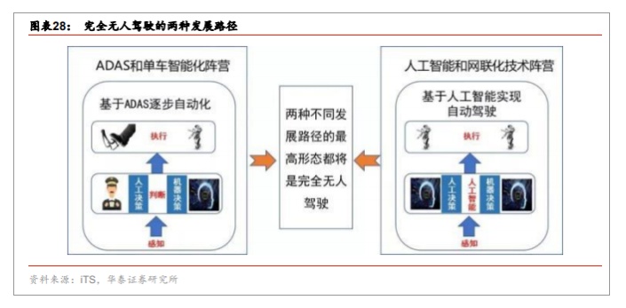 完全无人驾驶的发展路径大致分为两条,一方面,以谷歌、百度等为代表的科技公司以人工智能、新一代硬件为抓手直接布局L4以上自动驾驶。另一方面,传统车企基于ADAS从L3开始逐级迭代。这使得自动驾驶的产业生态分为两大阵营:1)以谷歌(GOOG.US)、百度(BIDU.US)、亚马逊(AMZN.US)等为代表的科技巨头;2)以奥迪、宝马等为代表的传统高端车企。