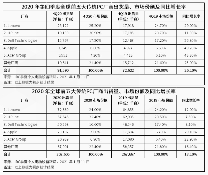 智通财经APP获悉,国际数据公司(IDC)全球季度个人计算设备追踪报告的初步结果显示,2020年第四季度全球PC出货量同比增长26.1%,达到9,160万台,联想集团(00992)份额上升到25.2%,而惠普(HPQ.US)下降到20.9%,前三大厂商中联想增长最为迅猛。