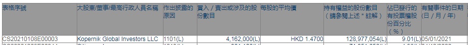 智通财经APP获悉,香港联交所最新资料显示,1月5日,Kopernik Global Investors 增持广深铁路(00525)416.2万股,每股作价1.47港元,总金额约为611.81万港元。增持后最新持股数目约为1.29亿股,最新持股比例为9.01%。