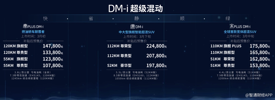 搭载DM-i超级混动的秦PLUS DM-i、宋PLUS DM-i、唐 DM-i “三剑齐发”,将以超强的动力,超低的油耗,超长的续航,可油更可电的驾驶体验在各自的细分市场中脱颖而出,同时凭借绿牌出行、畅行无忧的“快、省、静、顺、绿”多重优势,为消费者创造更美好的绿色出行体验。