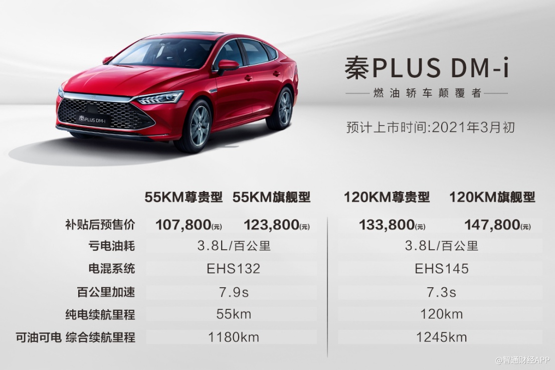 作为全球首款搭载DM-i超级混动的战略车型,秦PLUS DM-i是燃油轿车颠覆者。秦PLUS DM-i实现了紧凑型轿车市场前所未见的3.8L/百公里革命性油耗,百公里加速7.3秒,纯电续航里程120公里,可油可电综合续航里程1245公里(120KM尊贵型\旗舰型搭载EHS145)。秦PLUS DM-i补贴后预售价格为10.78万元-14.78万元,将于3月初正式上市。
