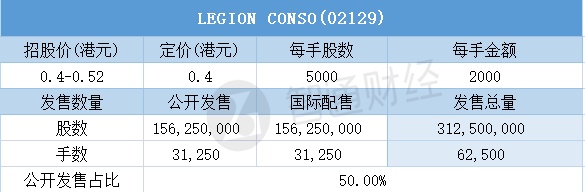 智通财经APP获悉,1月12日,LEGION CONSO(02129)配售结束。配售招股价0.4-0.52港元,最终定价0.4港元,每手2000港元。