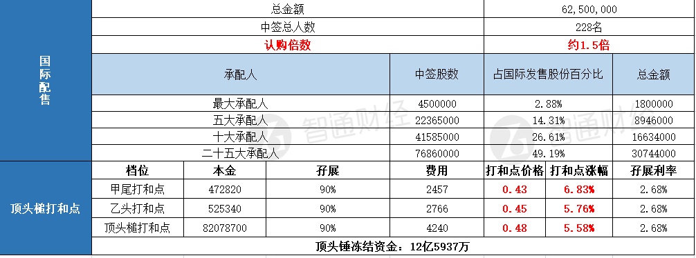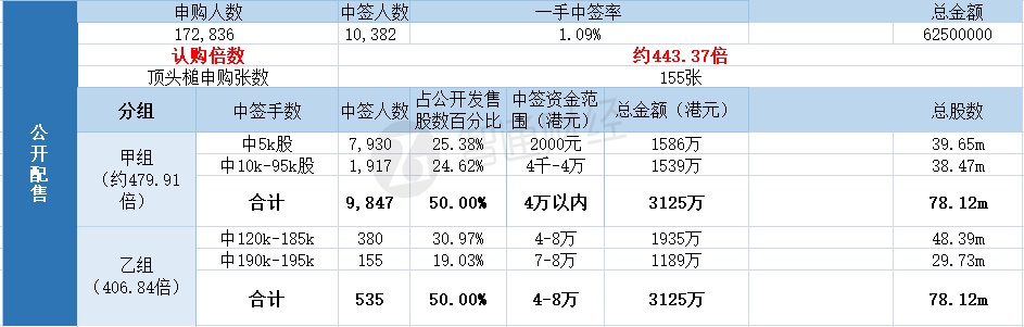 其中,公开配售申购人数172836人,一手中签率1.09%,认购倍数约443.37倍。