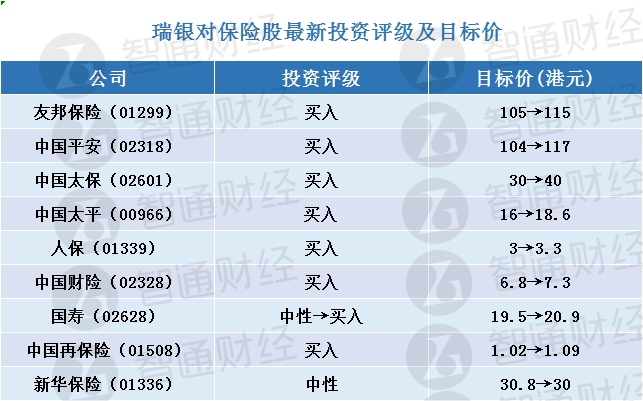 智通财经APP获悉,瑞银发布研究报告称,2021年除自公共卫生事件复苏外,相信投资者将聚焦于内地保险行业线上业务模式及由政府带领、覆盖较广及更可负担的“惠民保”,继续认为低端市场将更受数码化及挤出效应所影响,将2021年新业务价值增长预测由12%升至14%,相信投资者愿意付出估值溢价予差异化的业务模式:包括友邦保险(01299)在内地的扩张,以及中国平安(02318)的生态系统和技术。