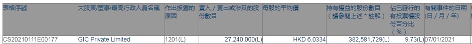 智通财经APP获悉,香港联交所最新资料显示,1月7日,新加坡政府投资有限公司减持洛阳钼业(03993)2724万股,每股作价6.0334港元,总金额约为1.64亿港元。减持后最新持股数目约为3.83亿股,最新持股比例为9.73%。