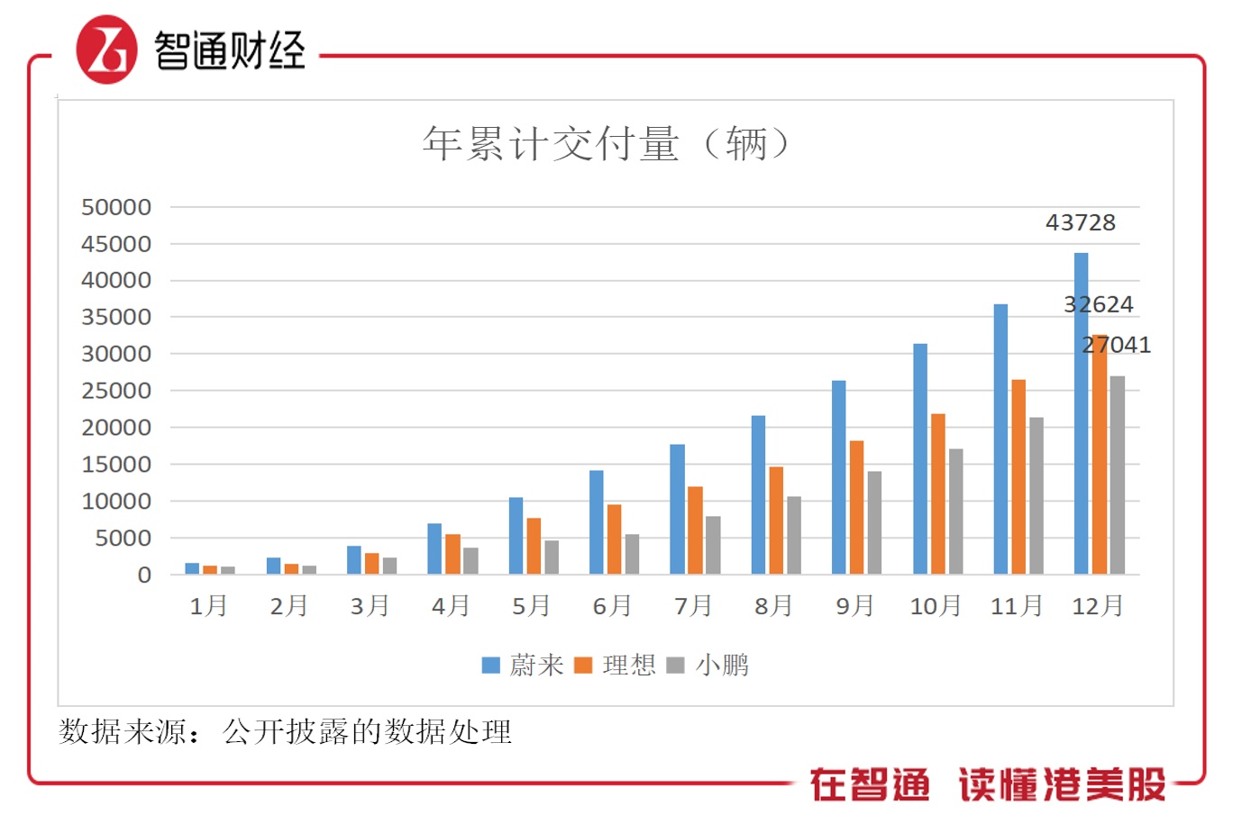 从数据上看,2020年12月份,蔚来实现交付量7007辆,全年交付量43728辆,领跑造车新势力,但相比于特斯拉仍有较大的差距,特斯拉于中国市场交付达14万辆,而全球市场交付量约50万辆,稳坐行业榜首。不过相比于其它造车新势力,蔚来具有较大的优势,2020年全年,理想及小鹏交付量分别为32624辆及27041辆。