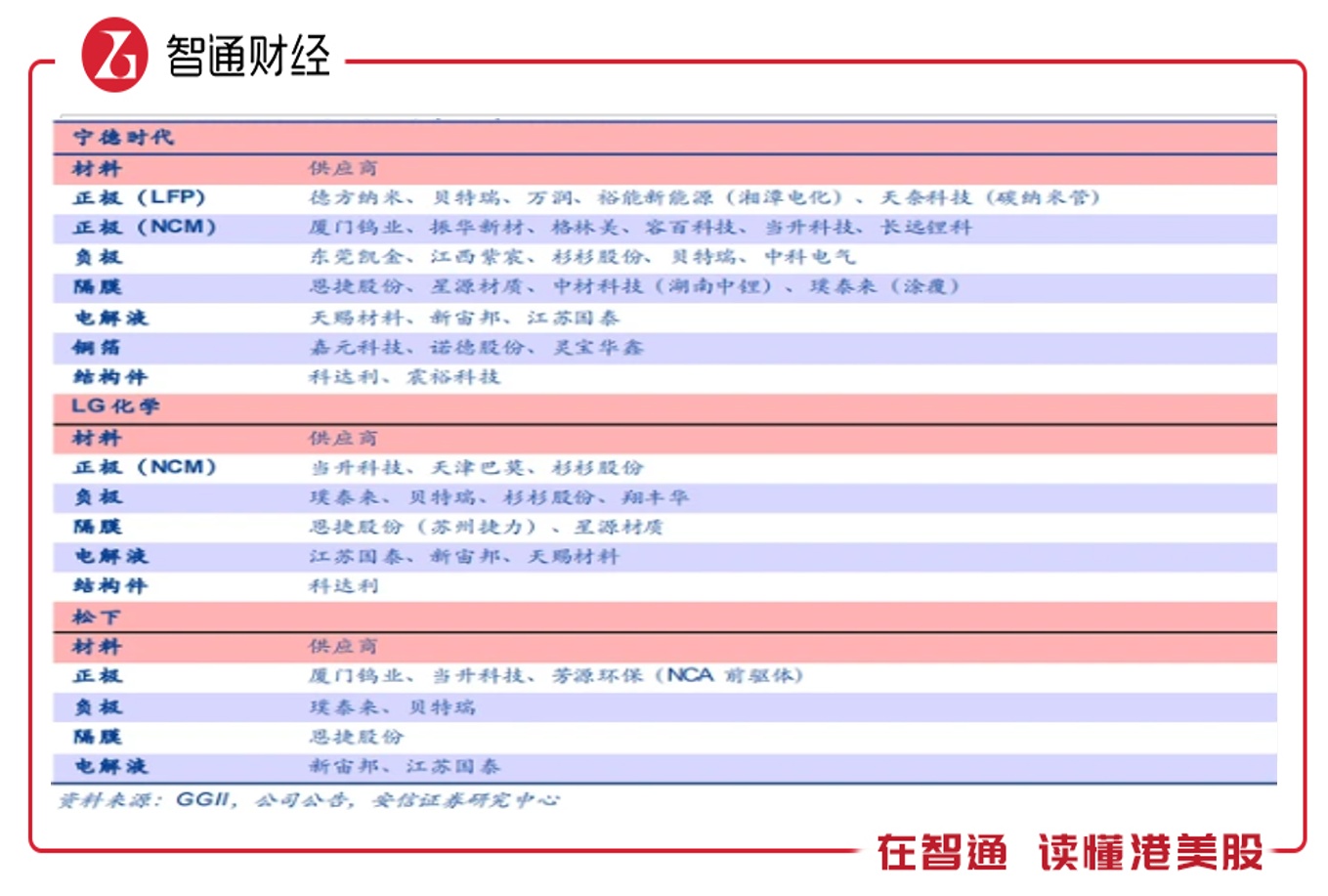 从电池上游端来看,电解液、隔膜及负极材料等细分行业龙头大都采取与下游挂钩模式,如电解液环节的新宙邦、湿法隔膜环节的恩捷股份、负极材料环节的贝特瑞,均已导入海外主流电池厂LG、三星SDI、松下的供应链体系。此外,NCM 正极材料龙头当升科技,已经实现SKI与LG 的批量供货。
