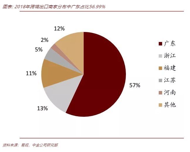 从商家分布和交易额占比看,华南是跨境电商产业的聚集地。根据易观数据,2018年全国跨境电商出口商家分布中,广东占比57%。在海关口径下的跨境电商进出口总额中,2019年广东省通过海关跨境电商平台统计的进出口总值1107.9亿元,同比增长45.8%,占全国跨境电商总值(1862.1亿元)的59.5%。其中,进口366.2亿元,同比增长21.3%,占全国的39.9%;出口741.6亿元,同比增长62%,占全国的78.6%。