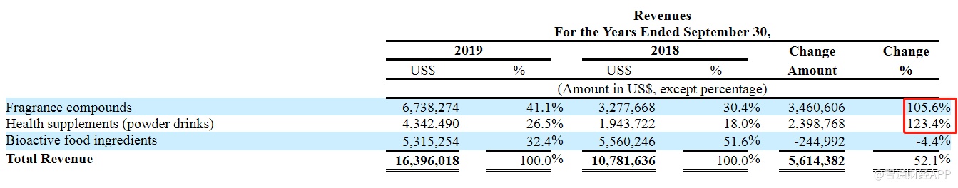 收入的增长主要得益于芳香化合物和保健品收入的提升。智通财经APP发现,2019财年时,天美生物的芳香化合物收入同比增长105.6%至673.83万美元,保健品的收入同比增长123.4%至434.25万元。而生物活性食品成分收入则下滑4.4%。