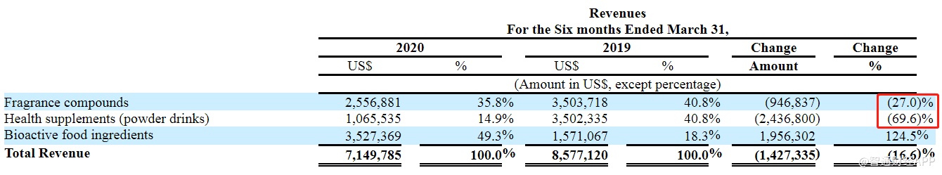 但进入2020年后,由于疫情的爆发,天美生物业务经营受到明显影响。据招股书显示,2020财年上半年时,芳香化合物收入同比下滑27%,保健品收入大幅下滑69.6%,但生物活性食品成分收入则大增124.5%。