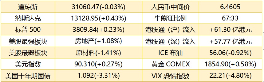 1、 截至美股收盘,道琼斯指数跌8.22点,跌幅0.03%,报31060.47点;标普500指数涨8.65点,涨幅0.23%,报3809.84点;纳斯达克综合指数涨56.52点,涨幅0.43%,报13128.95点。港股ADR指数小幅上涨,按比例计算,收报28330点,涨94.62点或0.33%。