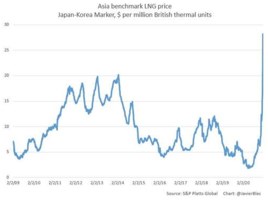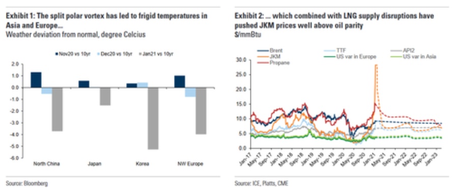 而在亚洲液化天然气价格飙升的同时,欧洲的寒冷天气也使荷兰产权转让设施指数(TTF)的价格在过去两天飙升29%至9.43美元/百万英热单位。对此,高盛表示:“欧洲西北部液化天然气交付量的降幅比预期的还要严重,可以看到,目前欧洲的供需平衡更加紧张了。”