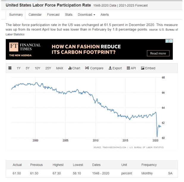 公共卫生事件为美国带来大规模失业人口,即使美国的雇主已重新开始聘用人力,但美国的长期失业人数仍不断增加,媒体指出,美国失业至少长达6个月的劳工人数,已约从去年9月的240万人,至今增至近400万人。但注意长期失业的人不会计算在劳动人口之中,即表示失业率(就业人口/劳动人口)即使就业人口没有上升,随时间的变动都会令到失业率下跌。而上图为美国的劳动力参兴率。可见仍处于相当低的水平,比2008年更差。